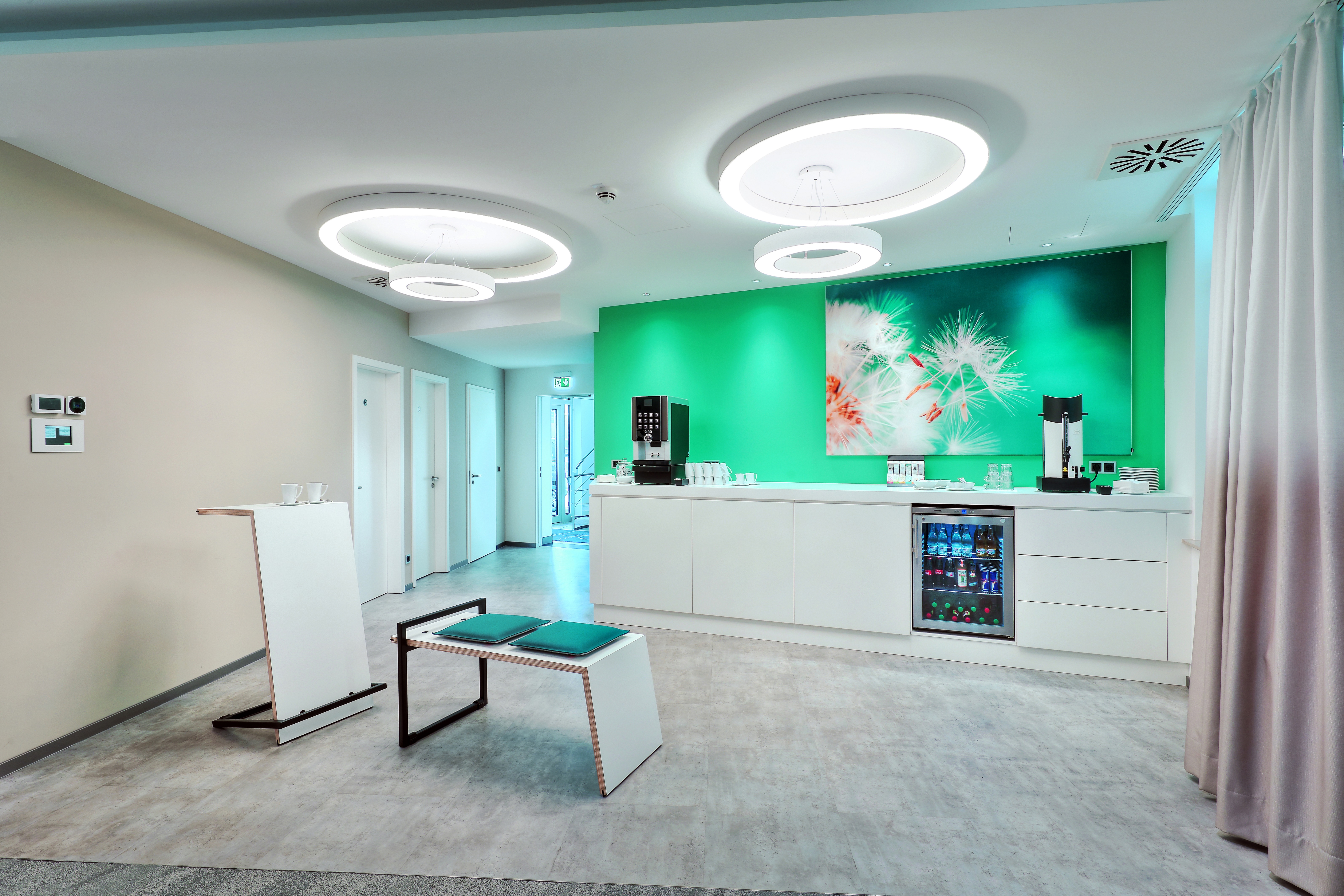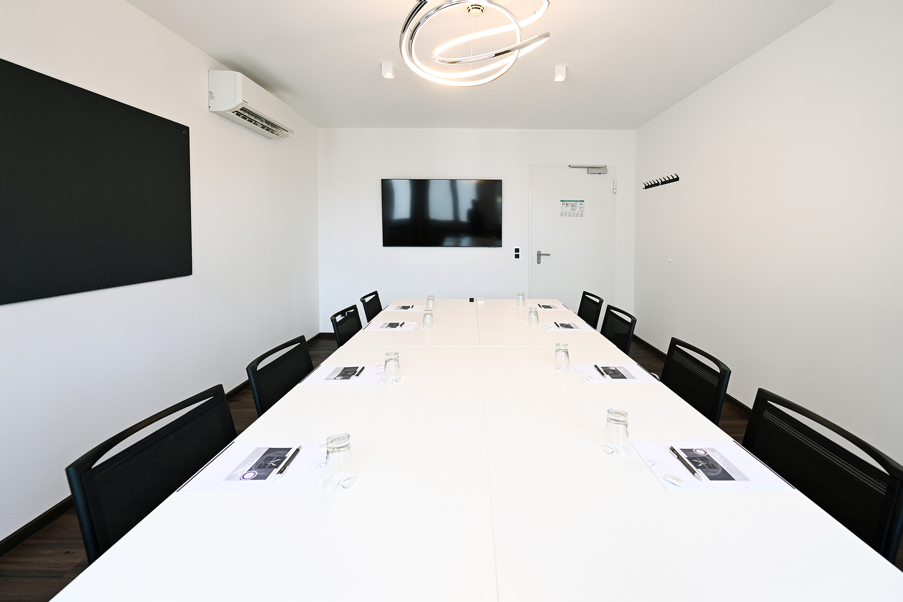 Des Weiteren steht eine Moderationswand inklusive Pinnwand und Whiteboard zur Verfügung. Der integrierte Pausenbereich lädt Ihre Teilnehmer*innen zu einem kommunikativen Austausch ein.