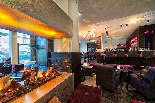 Smoky stained oak, friendly greys, colour accents. Always friendly service ensures a seamless transition to the evening. The bar fills up, the music gets a little louder, the light is dimmed, the atmosphere will be relaxed and comfortable.